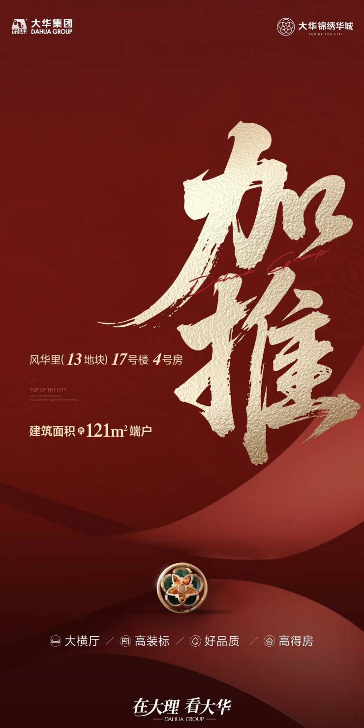 大理大华·锦绣华城,风华里(13地块)17号楼4号房,建筑面积约121㎡端户加推!大横厅、高装标、好品质、高得房!关注大理大华·锦绣华城的朋友可前往售楼处现场看房,咨询房源信息请拨打电话400-156-0036 转 406879!