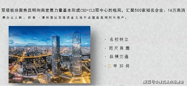 商业:世界双塔极核资产优选。双塔板块聚焦昆明向南发展力量基本形成CBD+CLD双中心的格局,汇聚500家知名企业、16万高消 费 办 公 人 群 。 邦 泰 · 璟 和 落 址 双 塔 烫 金 之 地 于 此 塑 造 昆 明 时 代 恒 产 。