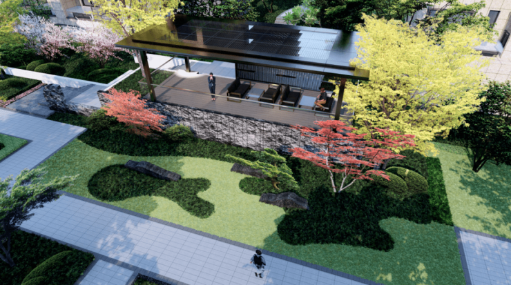 瑞园以冠云落影的自然风姿,将整个中心花园的禅意山水林、林间游步道、下沉草坪、休憩平台和阳光草坪串联起来,把归家路线和园林漫步的闲趣纳入风景中,每一步诗意盎然。