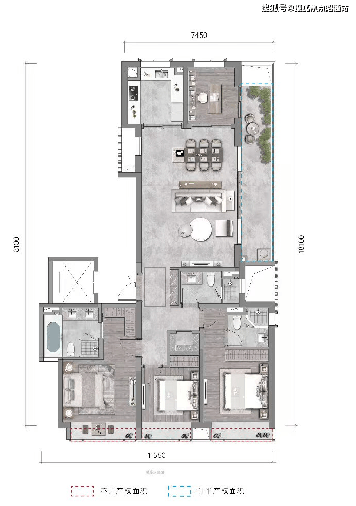 这个户型为四室两厅三卫,对于和父母同住的人来说,双套房设计让不同作息习惯的家人间能够互不干扰,也避免了共用卫生间的尴尬。