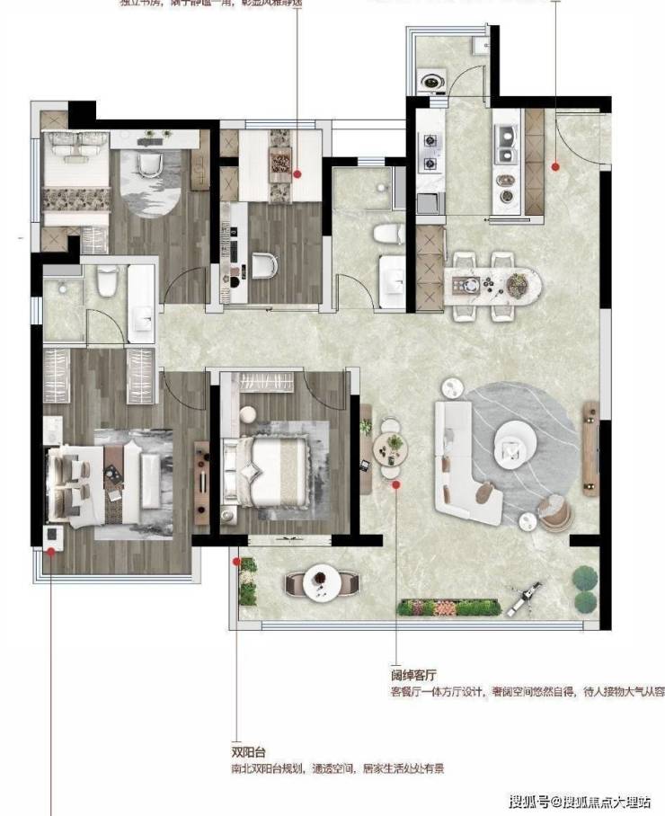 户型亮点:动静分区合理布局+约10.4米揽景阳台+独立入户玄关+双套房设计