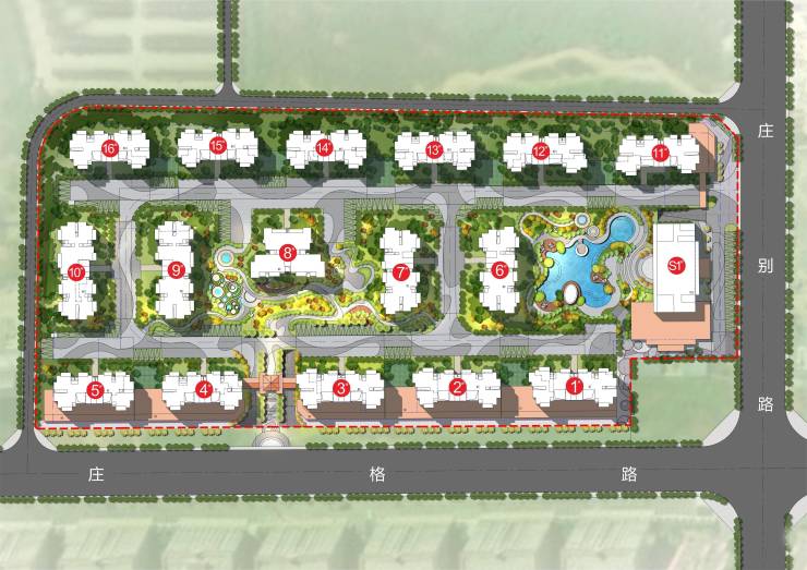 梯户比:其中12栋小高层主要以南北向布局,中轴景观楼栋以东西向布局