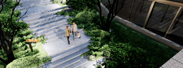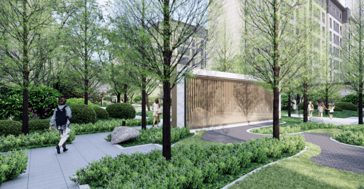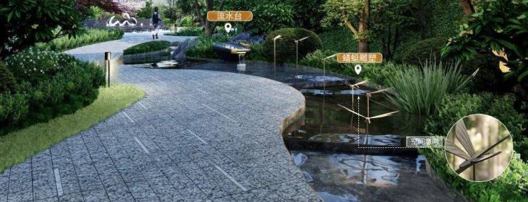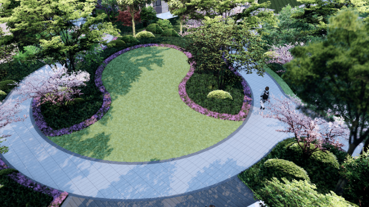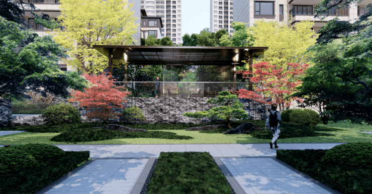 瑞园以冠云落影的自然风姿,将整个中心花园的禅意山水林、林间游步道、下沉草坪、休憩平台和阳光草坪串联起来,把归家路线和园林漫步的闲趣纳入风景中,每一步诗意盎然。