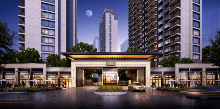 一镜衔云的归家入口设计,以庄重简洁的设计风格为主。入口广场、整齐排列的树阵,在项目外围即营造出大气、简洁的归家气场。居民出入口与车行出入口区分,在保证安全与便捷的同时,呈现名门归家礼序。