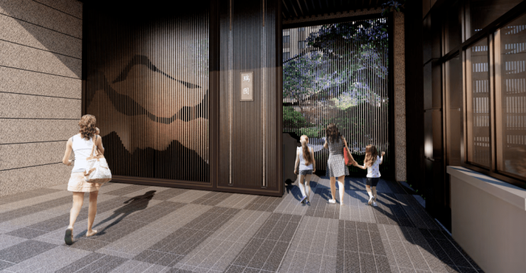 廊架外观构造,搭配四周的禅意景致,与花岗岩台阶、优选点景树围合成内敛、沉稳、适意的会客空间,于此交友会面、烹茶品茗,皆有雅趣。