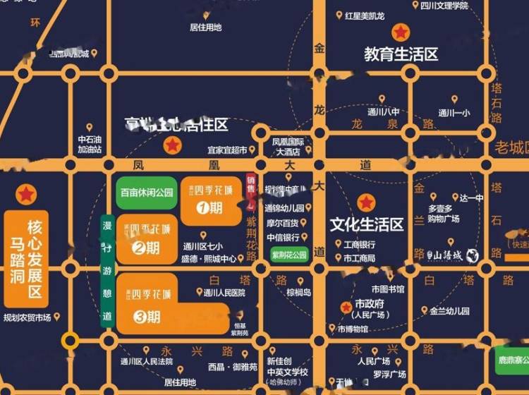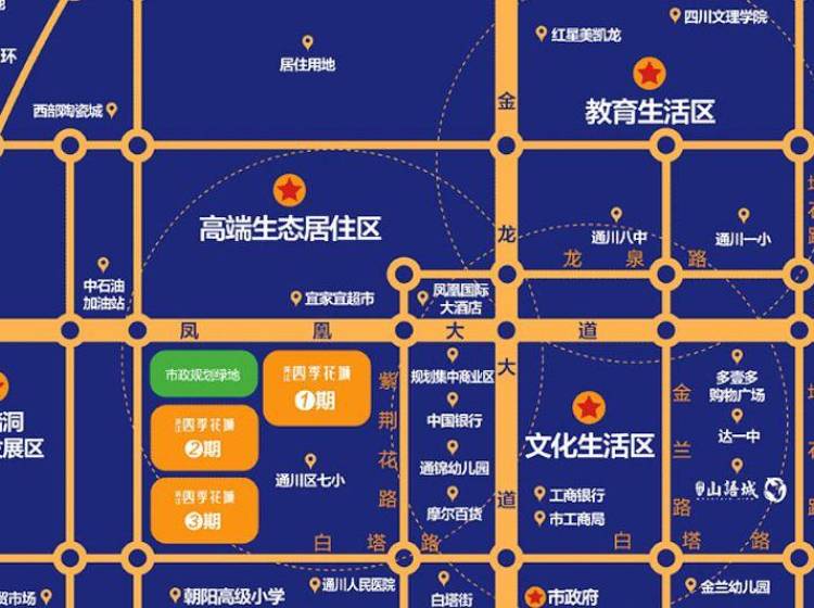 项目综述:西外榜样,百亩成熟大盘再升级 滨江R26;四季花城总占地约130亩,西外排名前列百亩大盘,达州当下最成熟、性价比较高的生活大城。 项目分三期开发,一期缤纷汇、二期花漫里;三期正在规划中。一期以阔景高层为主,面世至今一路热销,持续冠领西外,现已售罄。二期花漫里全新升级,特聘4家国内外知名设计机构、达州设计院、原龙湖集团等专业大师匠心创作两大新品——城市双层高赠洋房携瞰景风光高层,致献达州。 区域前景:达州看西外,西外还看四季花城。 城市发展向西,西外十年蝶变,成为达州极大区域发展和规划前景较好的区域,不只是城市的政治文化中心,更是达州的宜居生活中心。 西外重点发展三大片区,“高端生态居住区、文化生活区、教育生活区”共同筑就城市发展核心,但莲花湖片区受莲花湖水域限制,土地难以扩容,因此达州市委、市政府指示加快对新锦片区的后续配套建设,同时向马踏洞片区快速扩张,规划人口将达到40万人。 滨江R26;四季花城区域位置得天独厚,恰好位于高端生态居住区的核心地块,扼守连接西外三大片区的核心点。生活于此,既坐拥现已欣欣向荣的新锦繁华,又轻松执掌西外三大片区的发展脉络。 交通网路:扼守城市主动脉,10分钟内畅达各区 项目交通四通八达,出行进退自如。盘踞西外新锦凤凰大道与紫荆花路交汇处,沿紫荆花路车行3分钟即到达火车站;沿凤凰大道向东直行10分钟则到市区中心广场;随着凤凰山隧道的竣工通车,项目到达北外仅5分钟车程。 周边配套:住在花漫里,坐享繁华里。 四季花城R26;花漫里坐拥西外最成熟段,周边配套先进成型,2分钟生活半径里购物、教育、餐饮、休闲等一应俱全。 凤凰大酒店、摩尔百货、多壹多超市、通锦美食街、达人街、好一新等城市配套环伺1000米之内,规划中的通锦商业中心与项目仅一街之隔。 通川区人民医院、二医院等医疗机构近在咫尺,为家人健康护航一生。 片区内还入驻了哈佛国际幼稚园,达一中、八中等教育机构,七小新锦校区已在9月全面开学,且近在花漫里的家门口,让孩子从小在书香氤氲里快乐成才。 此外,项目内部还规划有2000平米独栋幼儿园,于繁华之外,再筑门第书香。 项目一期匠心打造2万方退台式情景街区,拟将引入“休闲、餐饮,娱乐,购物”等欣欣业态,目前已成功签约8000平方米多壹多超市旗舰店和达州较大巨幕影院-太平洋标杆店,此外特色餐饮、咖啡店也相继进驻。 自然资源:5000㎡中庭7重造景,百亩绿地自然鲜氧 城市里最不缺的就是建筑,但是花漫里的建筑是低调的,自然仿佛才是这里的主角。 项目景观设计匠心独运,特邀万科、原龙湖知名开发商的御用团队全程主创,构筑相当于12个篮球场大的中庭美景,占地约5000㎡,采用碟式围合、7重造景等园林大师手法,“地平、草地、鲜花、灌木、小乔、大乔与建筑”多重景观相互呼应,四季花开总有不同惊喜与生活不见不散。同时与百亩市政绿地为邻,散步运动皆有好去处。 产品价值:城市全跃层洋房&高赠景观华宅&十字金铺,三大产品致献达州 城市洋房第三代 ,成熟洋房恰到好处。 城市花院洋房全跃层,感受居住灵动性。邀请国外知名专家设计优于市场的洋房户型,全跃层设计,前庭后院格局。底跃带尊崇私家车库,顶跃享大露台。百变地下室盛放爱好,超大赠送可抵公摊还有赚,悦享洋房格调人生。 超大赠送景观华宅 ,较高赠送30㎡。 洋房前所未享,高层也蝶变升级。天生好视野好风光的高层,一直是多数人的选择。花漫里高层由4栋点式建筑围合而成,环抱5000㎡大中庭,较大楼间距70米,视野0对视遮挡。2梯6户,户户大阳台,户均赠送高达25%,空间更开阔尺度感更强,给城市全新的人居体验,超大赠送可抵扣公摊还有赚,悦享大城风光生活。 十字路口临街铺, 跟大牌赚大钱。 四季花城商业作为西外财富口岸,与5年前的通锦,3年前的罗浮知天下具备同样的财富位置属性——位处十字路口;坐拥自身以及周边业主15万稳固客群,与通锦商业呼应形成商业辐射圈,将辐射区域45万磅礴客流。低投入高回报,租金涨幅200%。以退台式情景街区首现达州,全家庭欢乐中心,未来将成为全达州人必达之地。已签约太平洋影院/多壹多超市等4大旗舰商家,跟大牌赚大钱。 品牌历练:滨江地产深耕西南 布局全国 滨江地产创建于2002年,成长于四川,发展于全国。是一家追求先进,专注品质和细节的公司,并长期与世界500强企业保持友好合作关系。已先后在达州开发九大品质名盘,成为达州美好人居的居住典范。2015年进军成都打造麓山板块奇迹大盘,10个月打破成都10年销售记录,正积极向陕西、贵州、北京进军打造领航大盘。17年的专业沉淀,实力品牌值得信赖,赢得无数掌声信任。