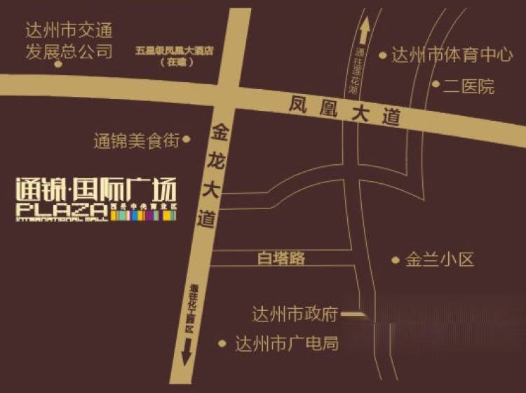 紧临达州市政府 、市广电中心、市工商局、市地税局、四川文理学院、达一中等,市二医院,中石油、中石化办公基地、高望都宾馆、鹏飞大酒店等市政单位及大型企、事业单位。 大型商业中心长约100米,宽约50米,每层5000平米,涵盖有大型购物超市、化装品、精品服装、影剧院、电玩城等。 大型商业中心前面和两侧均成了商业集散广场,这既是大型商业的前导性空间,也是集休闲、娱乐等于一体的露天广场,与通锦美食街道形成了片区商业的呼应与延续;既可为品牌酒店、大型商业服务、也将成为辐射区区域内的居民主外购物、休闲之所。