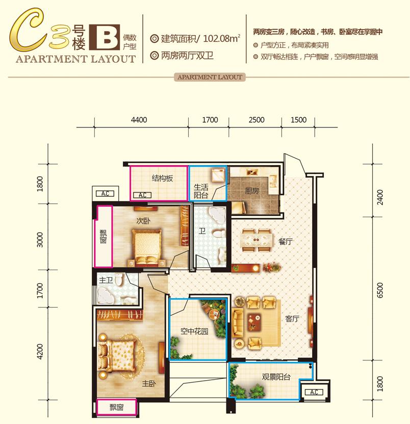 2室2厅2卫-C3-B偶数户型