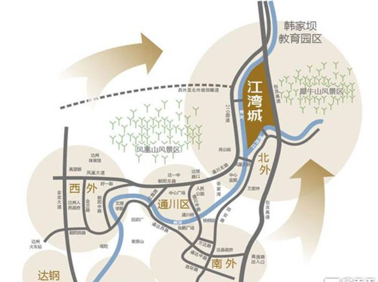 作为达州“北外滨江新区”一号启航巨著,江湾城,借山水资本,复刻世界湾区生活,以“一岛、两江、三核心、四板块”的城市高端生活综合体,为达州铸就城市封面,为“特大城市”标注繁华新中心。 江湾城,独占张家坝半岛,面观凤凰山,背枕犀牛山,东临明月江,西靠州河,于两江交汇处规划2600亩湾区,270°饱览江景,勾勒西南湾区轮廓。 出于对自然的尊重,对土地的珍惜,对城市品质的虔诚,江湾城走访沿海、欧美等国内外一线城市,探寻湾区都会的可持续发展模式—— “HOPSCA”,以健康、便捷、复合、可持续发展的城市模板,规划人居、商务、休闲、购物、运动、自然、文化等立体指标,划分中央生活区(CLD)、中央商务区(CBD)、中央休闲区(CRD)、中央文化区(CCD)等版块,构筑湾区之城的多功能内涵。