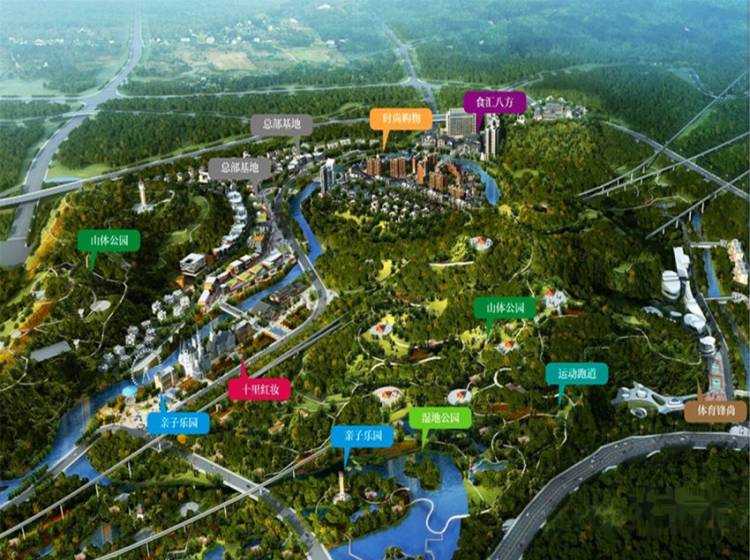 小区内部配套:购物公园、美食公园、亲子公园、总部公园、体育公园、婚庆公园“六大主题公园”,建有与之配套的居住区、山体观光区和湿地景观区。