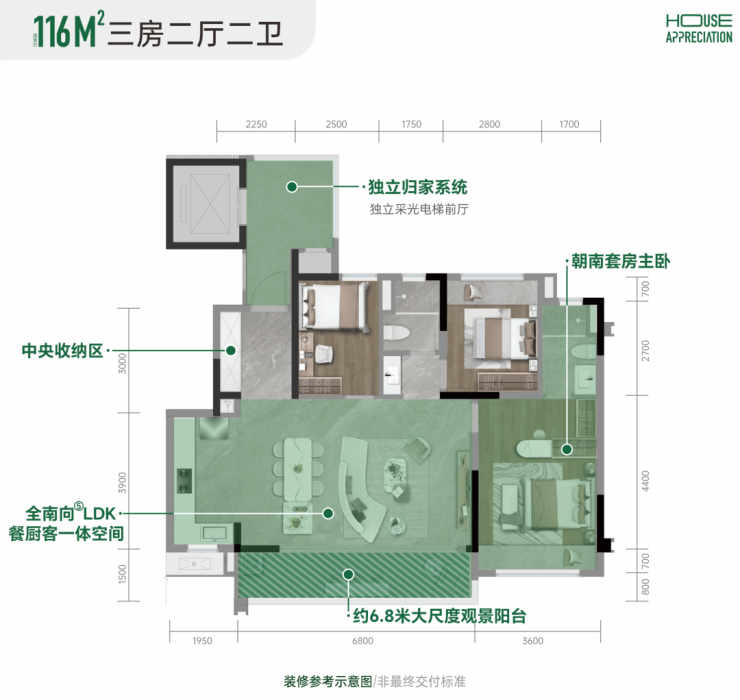 ※建面约116㎡三房,标配近10㎡电梯前厅现阶段成都楼市中流行的独立采光电梯前厅,几乎已经成为改善户型标配。