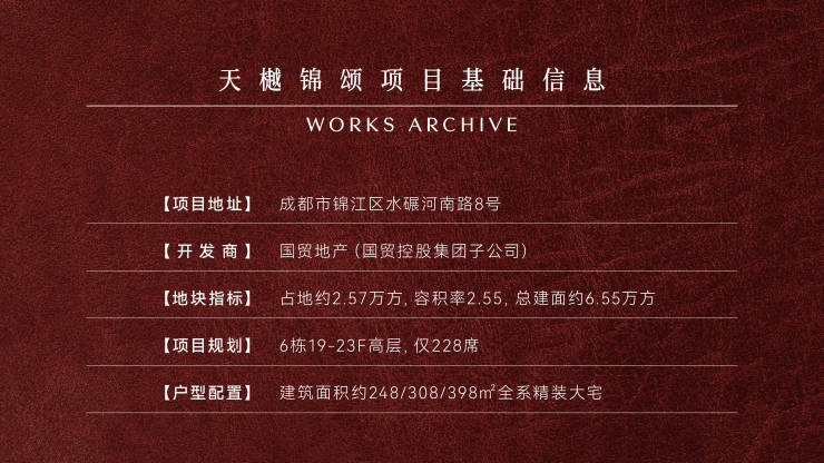 【国贸・天樾锦颂 | 天樾宸颂】是世界 500 强厦门国贸控股旗下国贸地产入蓉 5 载打造的顶序双子封面钜作,国贸地产作为中国房地产综合实力 TOP15 房企,拥有 39 年豪宅开发经验,在全国已打造厦门天樾云颂、福州国贸天琴湾、南京天琴华樟等多个全国知名顶豪项目,本次双子作品是集团倾注核心资源为成都高净值人群量身定制的一环稀缺新规地标豪宅,目前已位列成都主城千万级产品关注榜首。