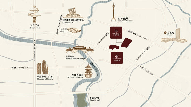 项目屹立成都一环核心,占位成都 3000 年恒贵高地,东大街一脉承续千年商脉与交子金融基因,是集历史底蕴、金融核心、时尚封面与高端住区于一体的城市核心极,居住价值与收藏价值兼备。