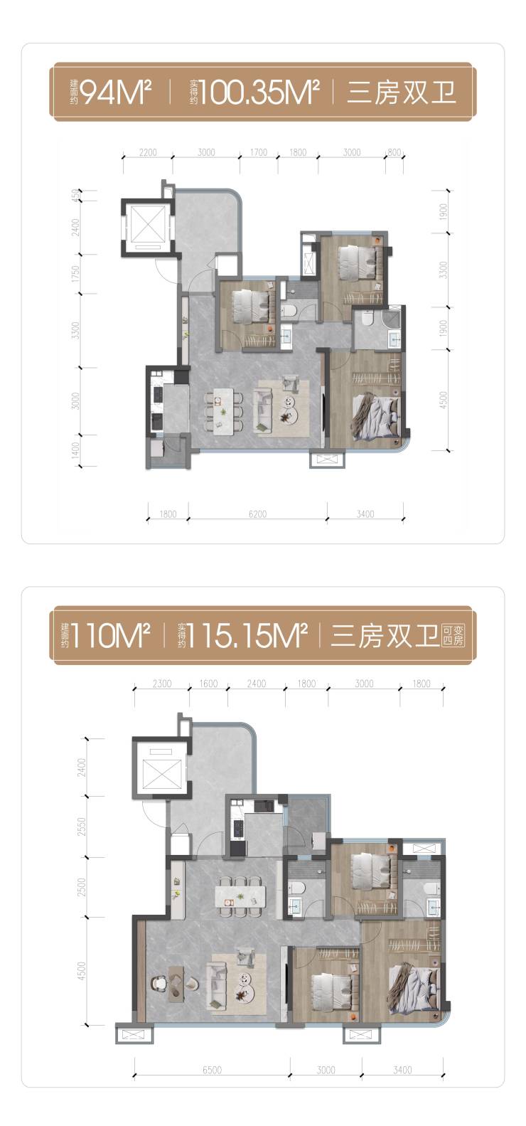 【产品面积】建面约94㎡的3房2卫、建面约110㎡的3房2卫(可变4房)