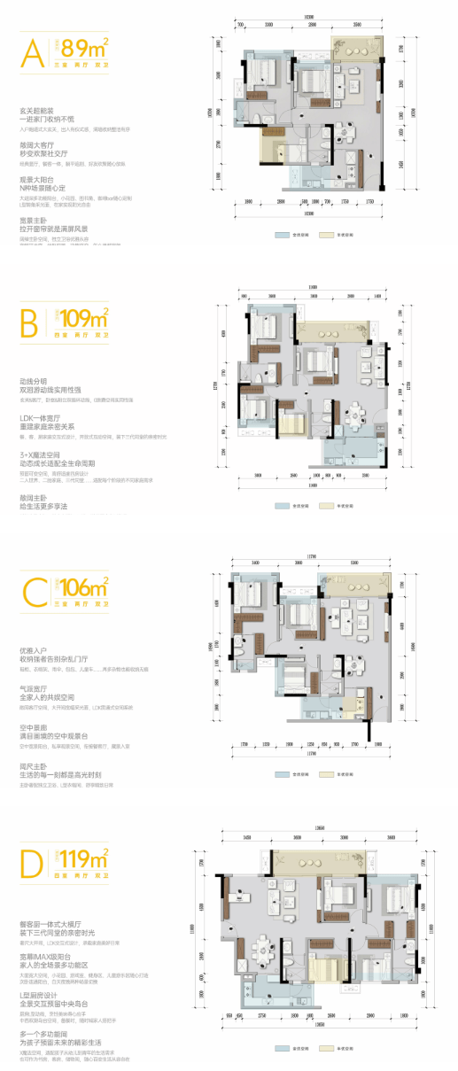 全系89-119㎡功能型户型,以三至四房全能配置,精准覆盖从新婚首置到二孩刚改的家庭全周期