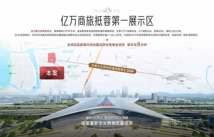 亿万商旅客流抵蓉第一展示区,西南最大高铁枢纽天府新站,明年即将投入使用,地铁18和19号交汇于此,形成空铁一体化。年旅客吞吐量1.2亿人次/年,日均约33万人次。将超越东站和北站商旅人群总和。