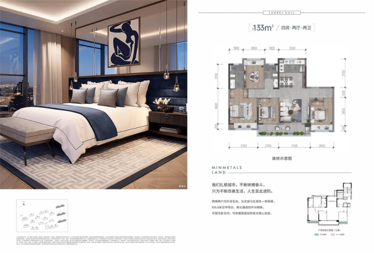 • 6.8米景观阳台+4米开间客厅• 四室朝南+主卧双衣帽间• 独立候梯厅+双玄关系统
