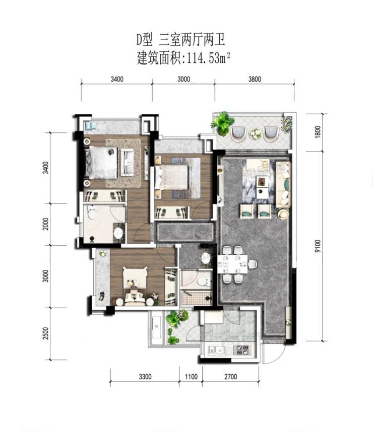 户型面积约115㎡套三双卫,客厅长达到9.1m,宽3.8m,竖厅设计