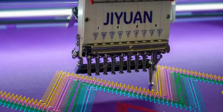 一幅幅日月、山川、虫鱼图随着机床电脑的传输控制着十台穿针机九十根针在一块块纯色布料上编织而出