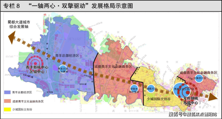 在《规划纲要》中,明确了青羊区“一轴两心,双擎驱动”的城市空间发展格局。其中: