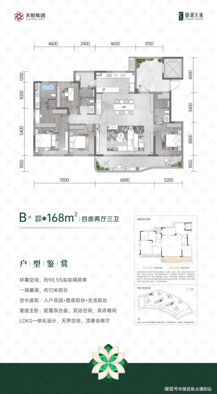 由北京天恒置业倾力打造的「天恒御湖天境」,占地61.7亩,容积率仅1.5,绿化率达30%,打造低密宜居社区。项目规划8栋住宅共220户,配备4栋商业综合体(含商业街区及星级酒店)。住宅均为11层小高层,采用2梯2户设计,公摊19%并赠送12㎡入户空间,实际得房率高达98%。