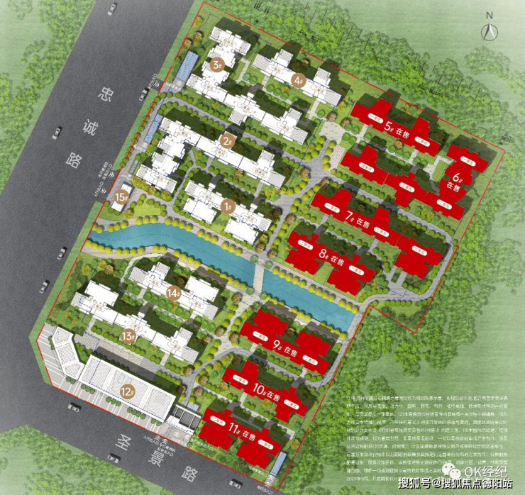 项目西侧临忠诚路、南侧临圣景路。占地约80亩,由一条2800㎡的中轴河景划分为两个地块,容积率仅1.62,绿地率约30%,仅布局13栋6层滨水电梯纯洋房。
