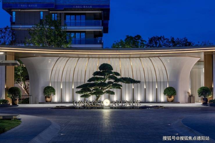 【门庭礼制,高定私域界标】以银杏的叶脉肌理为原创灵感,曲线工艺将32个色温3000K的灯柱平行排列,灵动线条镶嵌在香槟金的质感之上。约60米奢阔门楣,搭配环形水景、造价约20万的罗汉松,打造尊贵门面