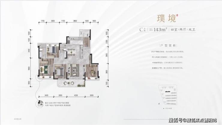 T2楼栋:中庭楼王(清水)?层高:16层、梯户比:2梯2户;板式布局⛩层高3.15米、一楼4.5米架空?公摊20.8%(全四房户型)【C璞静】:建面约143㎡,四房两厅两卫