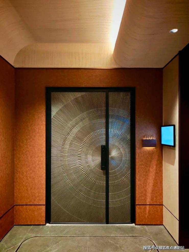 门扇的两侧,则是提取了成都特色的蜀锦纹样以芙蓉花定制了专属标识,通过3D立体雕刻的金属屏风;