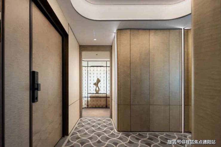 进门后的十字玄关区域,地面采用了大理石艺术拼花设计,墙面上做了隐木木皮收纳系统,包括鞋柜、800库等功能都隐藏在了大气的玄关空间之中。