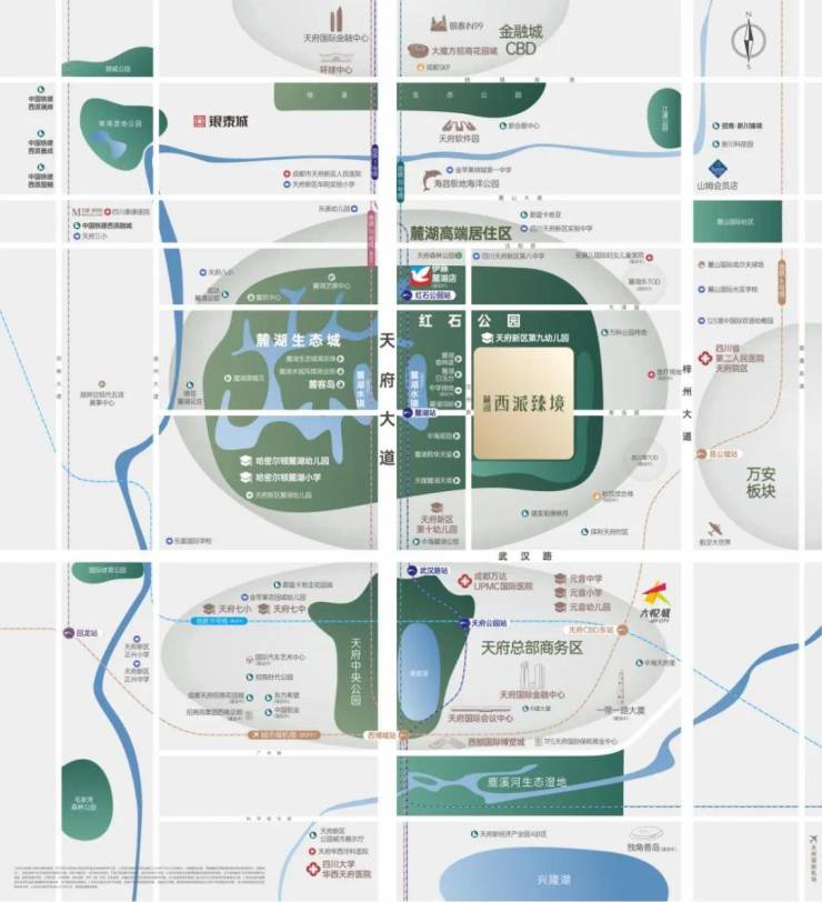 麓湖,高端资源集萃,近邻成都高级烟火,约百万方麓湖高端商业群落,教育、艺术、娱乐、商业等丰盛配套荟萃,随时趣享国际潮流、格调生活。