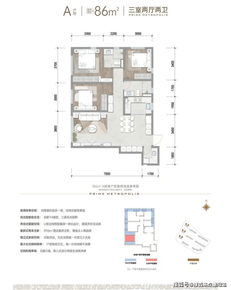 86㎡(2T4户,得房率约30%)