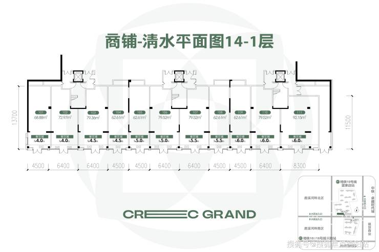 14.得铺率高:公摊率极低,得铺率极高,仅约1.8%公摊,且8间商铺额外赠送约3㎡