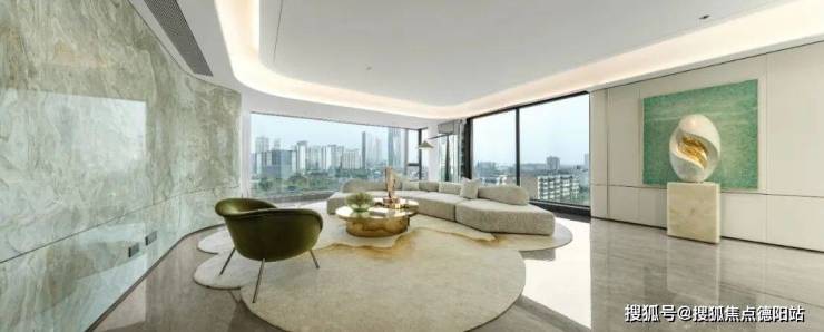 顶面采用了无界悬浮圆弧吊顶,地面选用了900×1800mm的大板大理石瓷砖,墙面除了大面积落地玻璃外就是皮革硬包饰面,另外还有安第斯雪景奢石包裹的电视墙作为点睛。