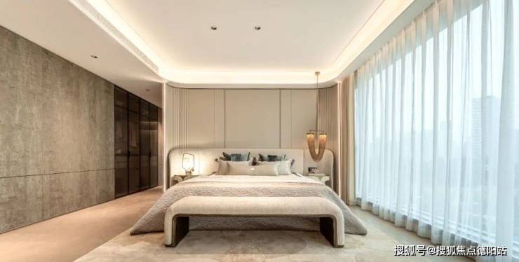 在卧室区域,同样做了弧形GRG吊顶,并为主卧配置了皮革背景墙,以及定制的花瓣形木地板。