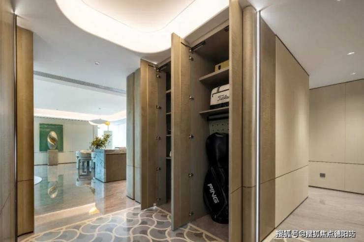 进门后的十字玄关区域,地面采用了大理石艺术拼花设计,墙面上做了隐木木皮收纳系统,包括鞋柜、800库等功能都隐藏在了大气的玄关空间之中。