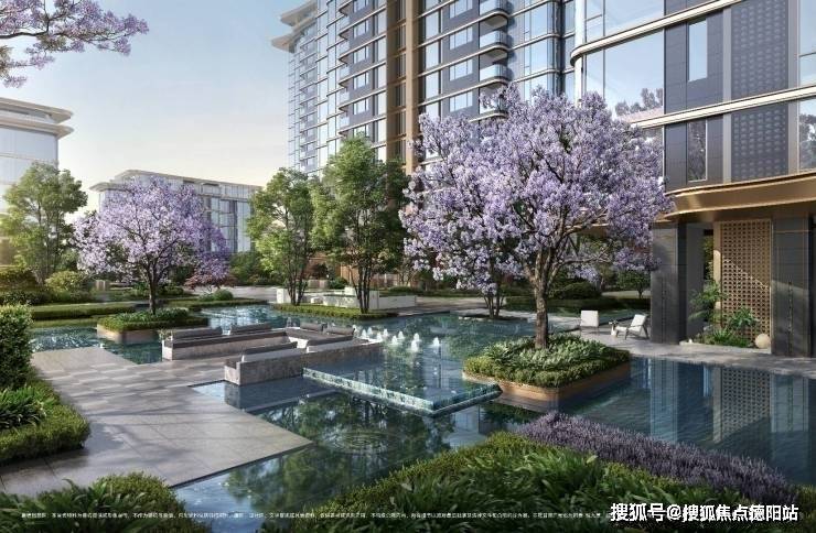 ▌【景观篇】 14%软景中水景占比约14%,媲美百亩级大盘水景规划引水入园,打造三大中庭水景,总计约1400㎡水系面积。甄选紫薇、泰山油松、蓝花楹等全球名木,匠造九章景观节点。