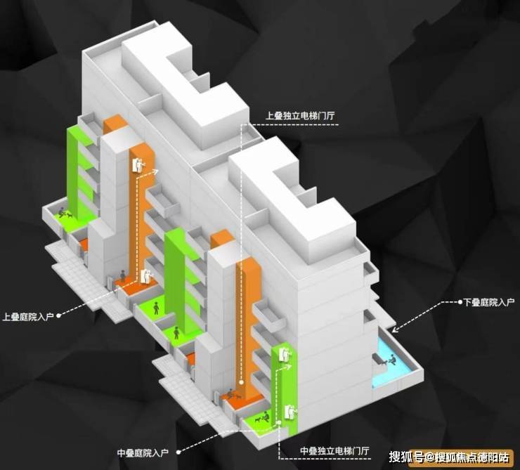 采用6+1模式,中下叠地上两层,上叠为2.5层(屋顶房间+露台)。