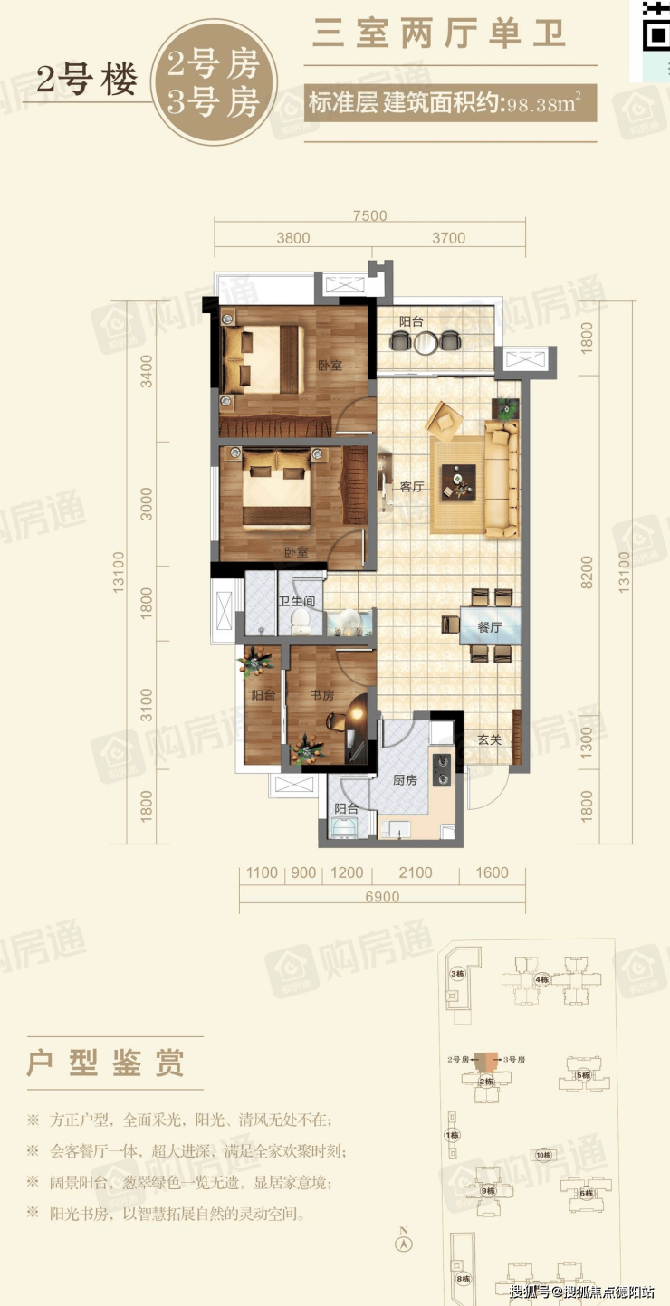建面98平套三单卫