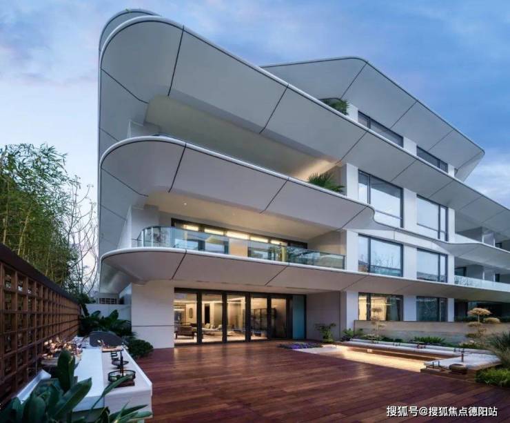 清凤·鹿溪源,沿袭大师艺术灵感,外立面以超级游艇为形,采用高规格铝板搭配Low-E中空玻璃,流线型双曲琉光立面,勾勒出流畅简雅的艺术气息;约40%窗地比,大面积玻璃幕墙如同镜面,倒影天光云影,温润质感如美玉。搭配U型跑道式阳台,营造270°环幕端景视野,媲美游艇全景舱,将庭院山水画卷尽收眼底。