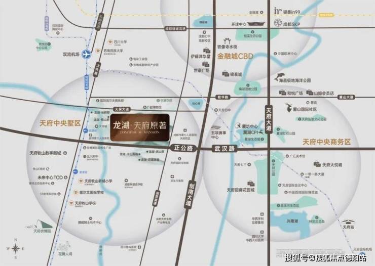 沿着天府横中轴武汉路,从天府CBD向西驱车,5首歌的时间就抵达天府中央墅区。这个距离,和阿瑟顿到硅谷核心区一样,都是20分钟左右车程。不仅如此,它和城市科创核——成都科学城、金融核——成都金融城也保持着第一居所的距离。