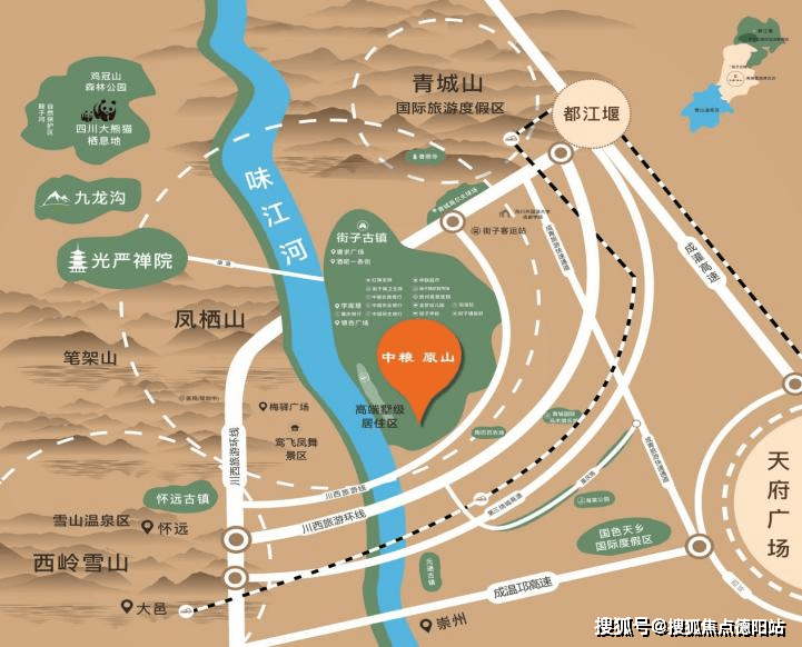 中粮原山毗邻川西旅游环线,还有成青旅游快速通道、成灌高速、成温邛高速、成都三绕等四条快速通道与成都接驳,以及直达成都的大巴,成功融入“成都1小时经济生活圈”。而项目旁的街子古镇,不仅坐山拥水,山河壮丽,而且有厚重的人文底蕴,气候湿润,宜居宜游。