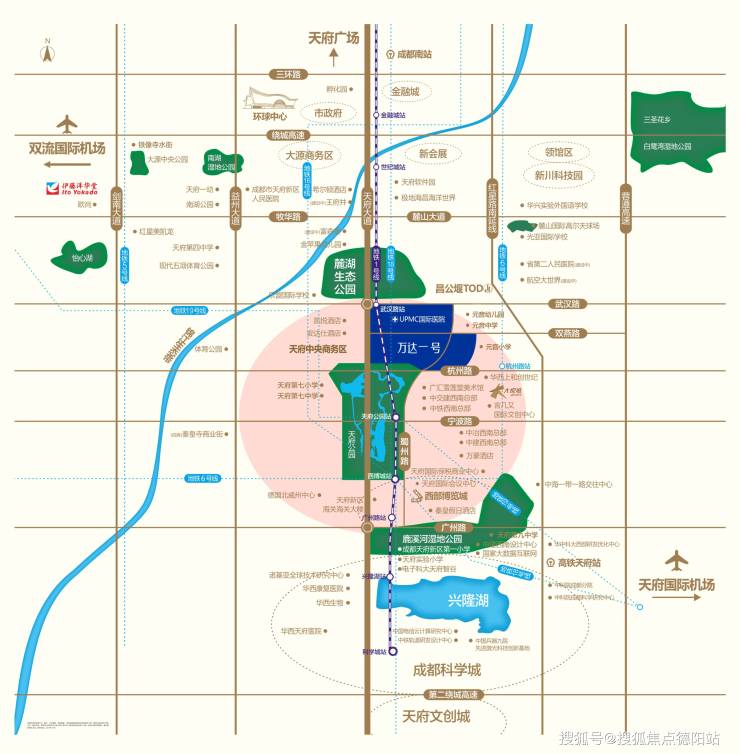 轨道:地铁1号线(武汉路)、6号线(杭州路)、18号线(天府公园站)、19号线(西博城站),离项目3.9公里便是天府新区首个TOD的昌公堰站站点、成都市第一个城市候机楼。