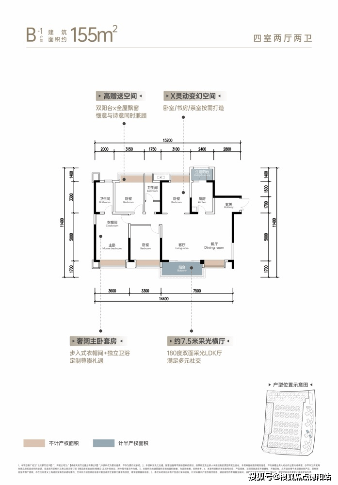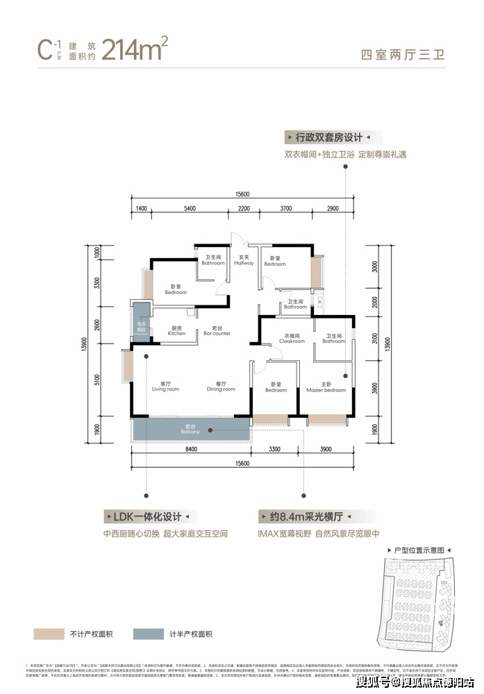 约214㎡奢居四房:约8.4m横厅,270°采光,双套房设计
