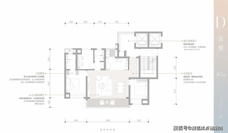约6.8m奢阔横厅开间,开放式家庭核芯区,大尺度互动空间