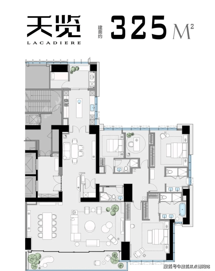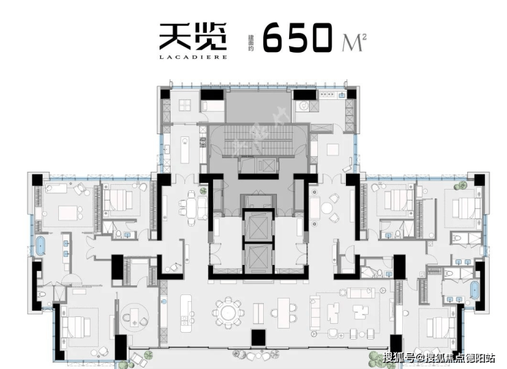 户型方面,遵循蔚蓝卡地亚“一大三好”原则,户户超大户型,半层325平起,楼王“一层一户”650平起,纯粹的面积段,定位更加匹配「超级豪宅」的定位。