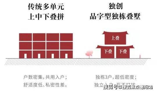 建筑构型为全国独创“单栋两叠三户”式“品”字形结构。这样的建筑结构,直接舍弃了中叠户型,换来了珍贵的“天地”空间,使得下叠户型和上叠户型均实现了“有天有地”的居住享受。