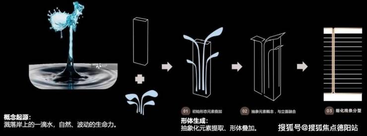 以滴水流体塑性为灵感,延续臻系建筑立面美学,以“锦水曲线”为灵感,形成极具韵律的曲线瀑布造型。在颜色萃取上,从蜀锦正色中提取元素,通过香槟、中灰、米白的搭配,营造出一种跟随自然的律动。