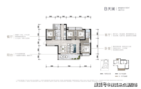 高层142㎡套四双卫套四双卫,南北通透,本户型可以满足三口之家、三代同堂等多种生活场景,阔景横厅设计,带超大景观阳台,给业主尊贵生活体验。