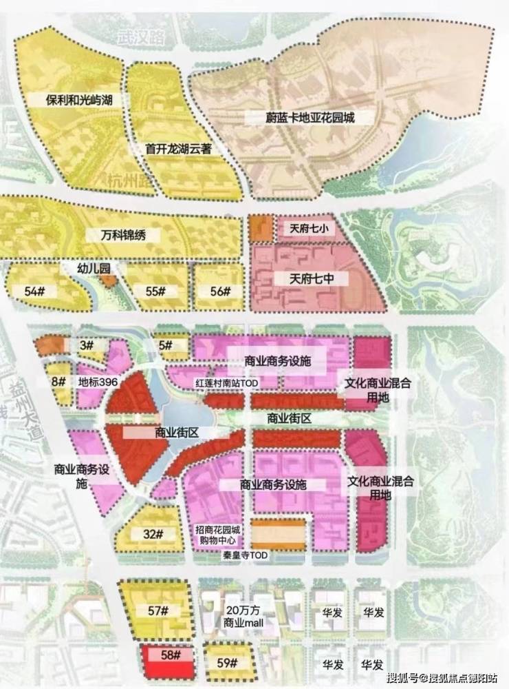 而围绕着项目南侧的人字绿廊核心地段,共涉及5条地铁轨道以及4个TOD站点,项目距离最近的地铁19号线红莲站步行距离约500米。